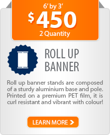 Roll up banner stands are composed of a sturdy aluminium base and pole(s). Printed on a premium PET film, it is curl resistant and vibrant with colour! Banner stands are retractable allowing for quick set-up and take down while providing excellent protection when not in use.